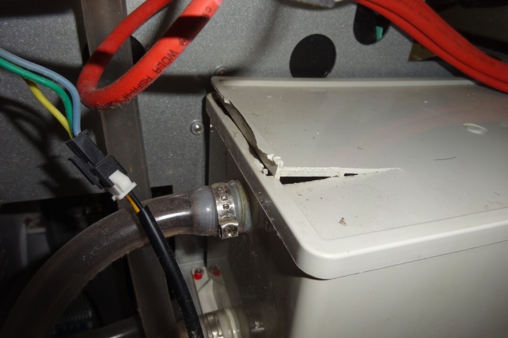 早速内部を確認しましたら、1台がお聞きしていた故障内容とは全く異なる冷却水タンクに破損がありました。原因が特定できませんがタンク内部から押されたように割れています。